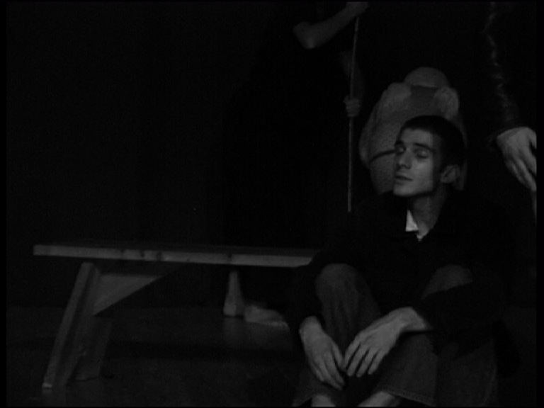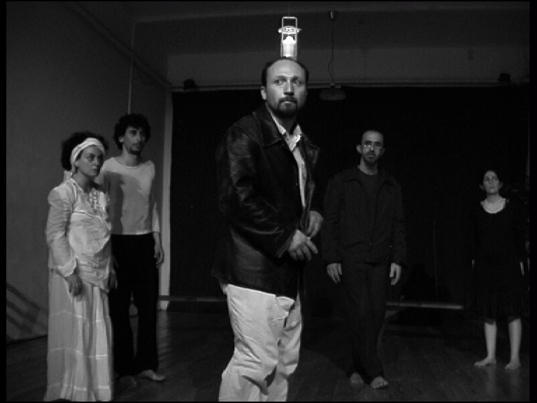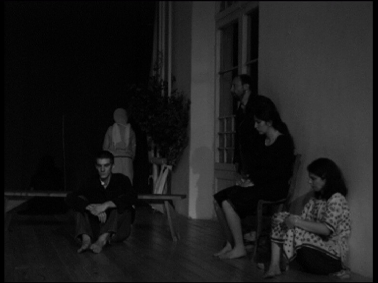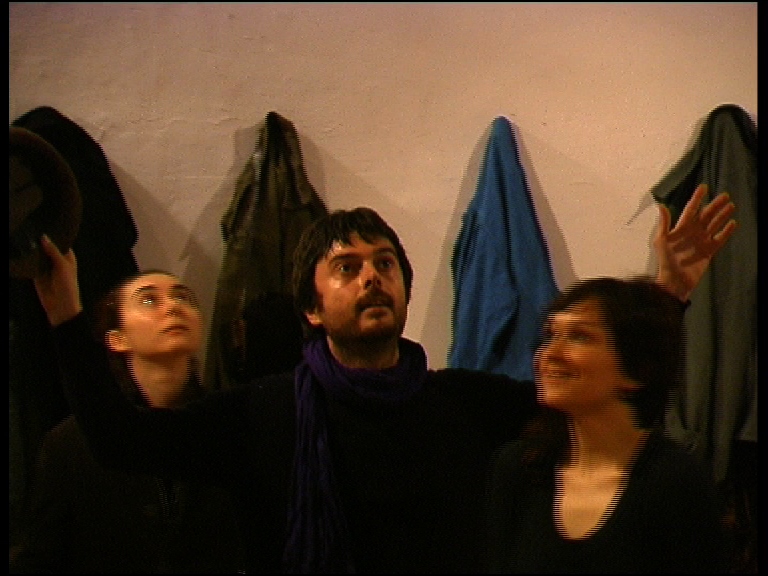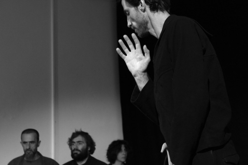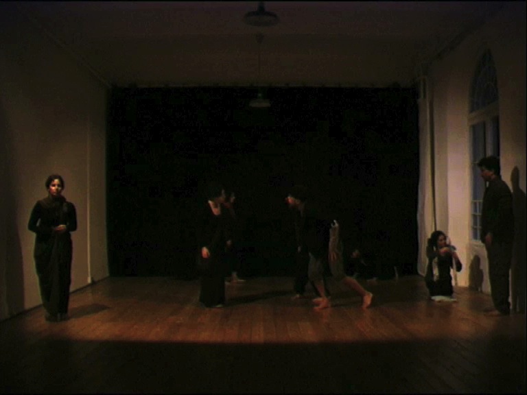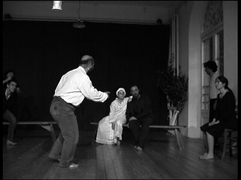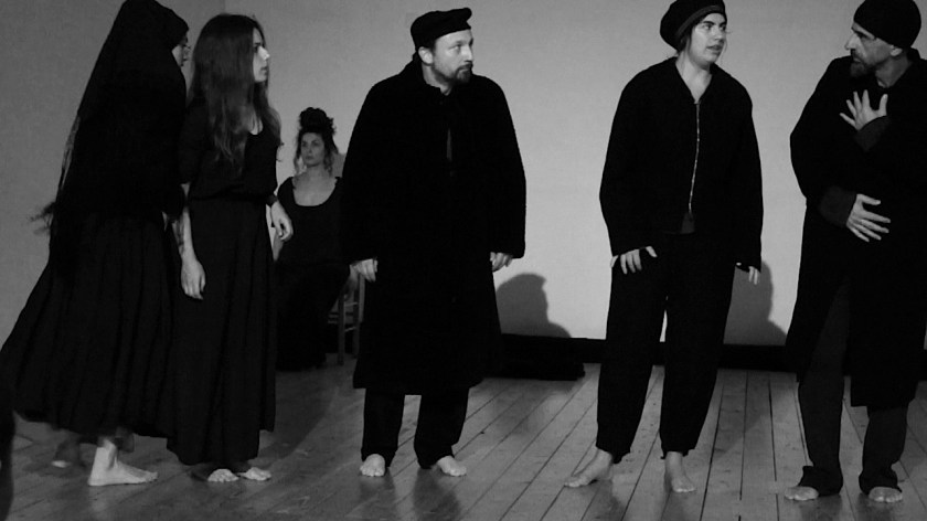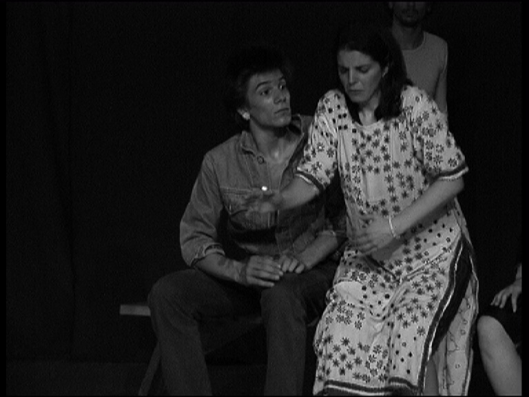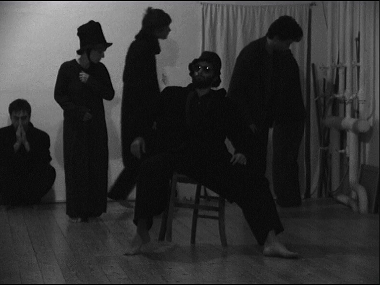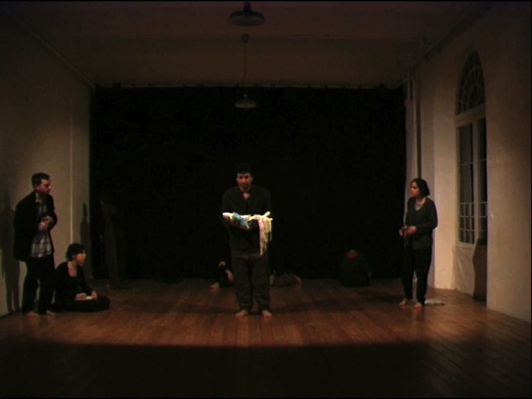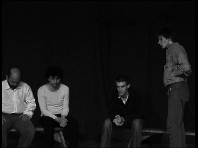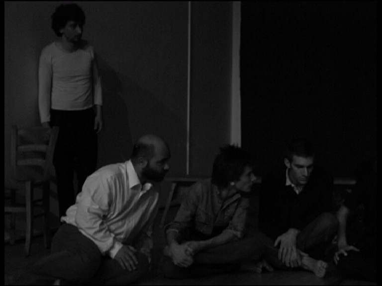 Tutti insieme si alzano – 3,4 sedie–alcuni sono in piedi o seduti a terra. Qualcosa di agitato, di confuso, due vogliono la stessa sedia, sono irrequieti, agitati e finiscono per sistemarsi molto vicino gli uni agli altri. Si guardano. Curiosità. Attrazione – cambiano posto – si osservano – uno si leva la giacca la rimette -uno ha freddo – attesa – impazienza. Pazienza – stanchezza – abbozzi di gesti verso l’uno o l’altro – uno fa come per andar via ed è tirato dentro da un altro.