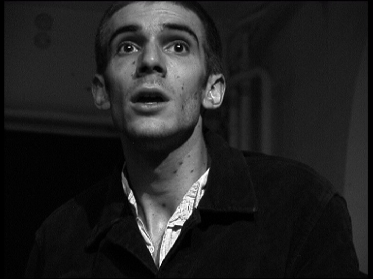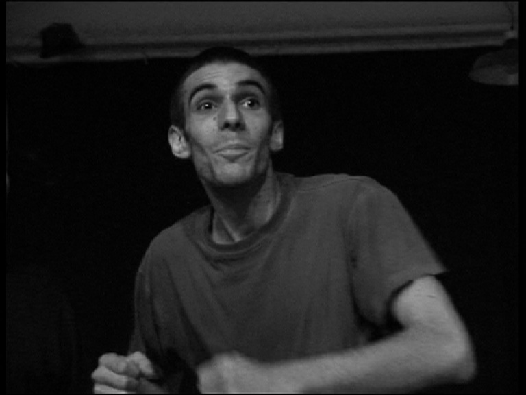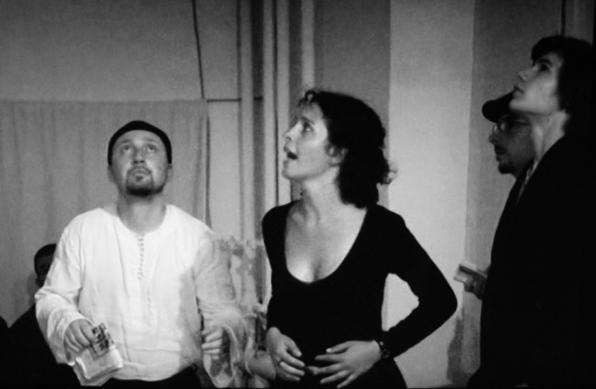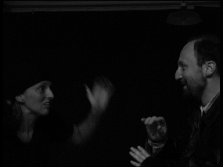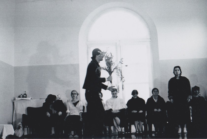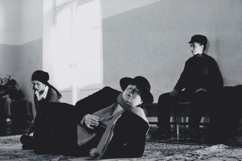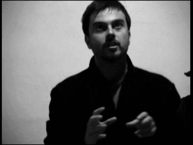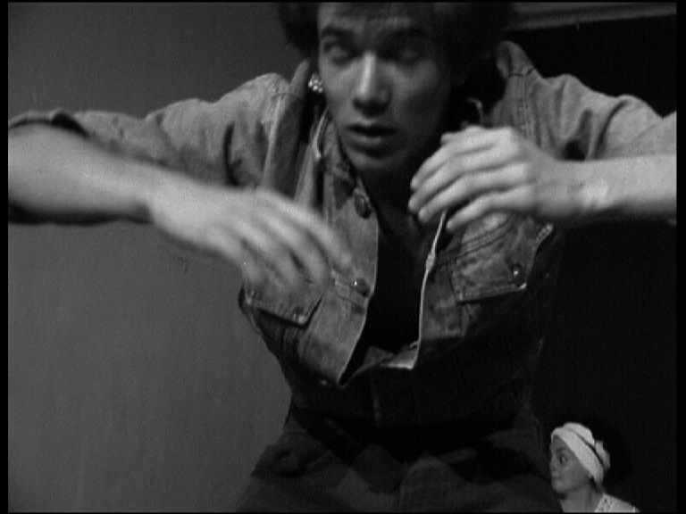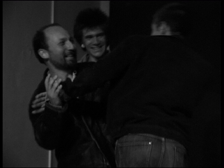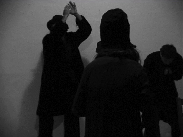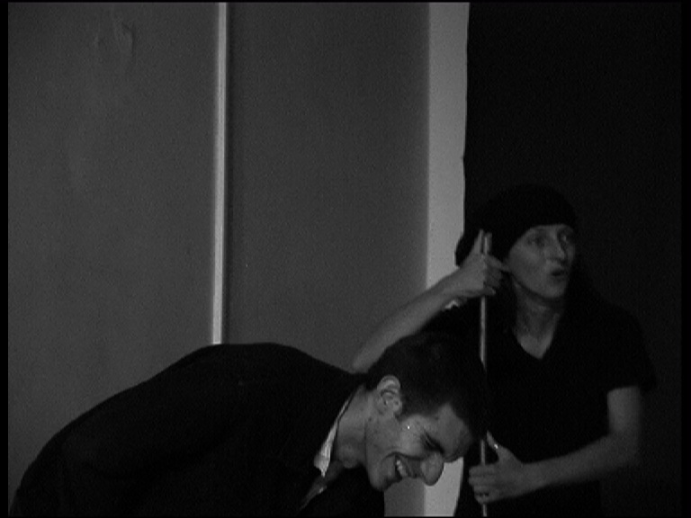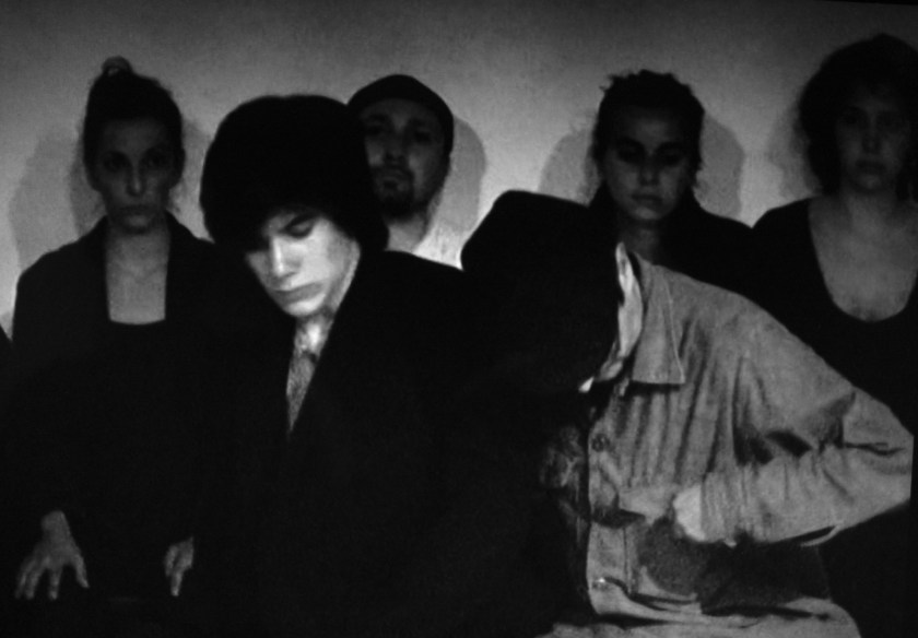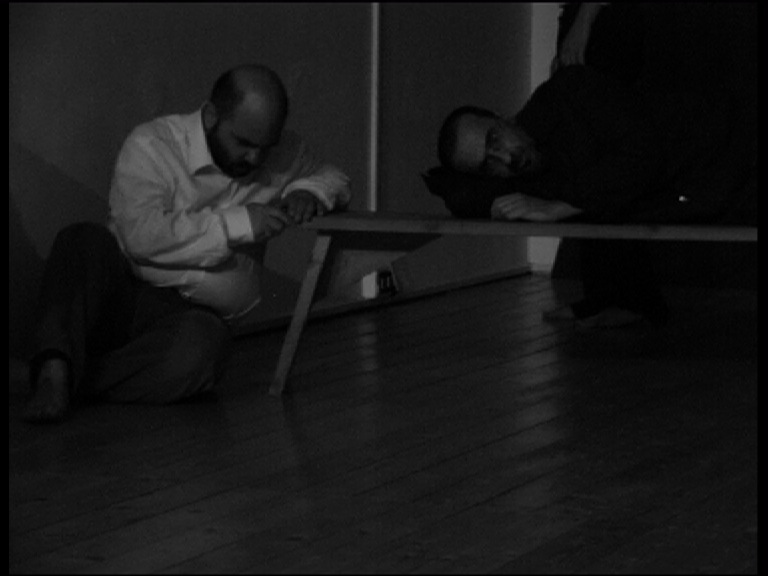 Tutti insieme si alzano – 3,4 sedie–alcuni sono in piedi o seduti a terra. Qualcosa di agitato, di confuso, due vogliono la stessa sedia, sono irrequieti, agitati e finiscono per sistemarsi molto vicino gli uni agli altri. Si guardano. Curiosità. Attrazione – cambiano posto – si osservano – uno si leva la giacca la rimette -uno ha freddo – attesa – impazienza. Pazienza – stanchezza – abbozzi di gesti verso l’uno o l’altro – uno fa come per andar via ed è tirato dentro da un altro.