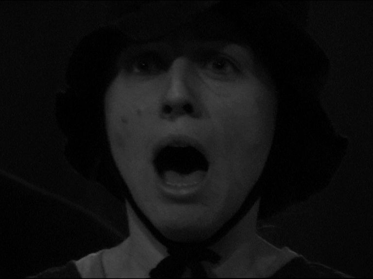 Serena gets up, takes two steps forward, opens her mouth, gestures left and right as if to call out the words.