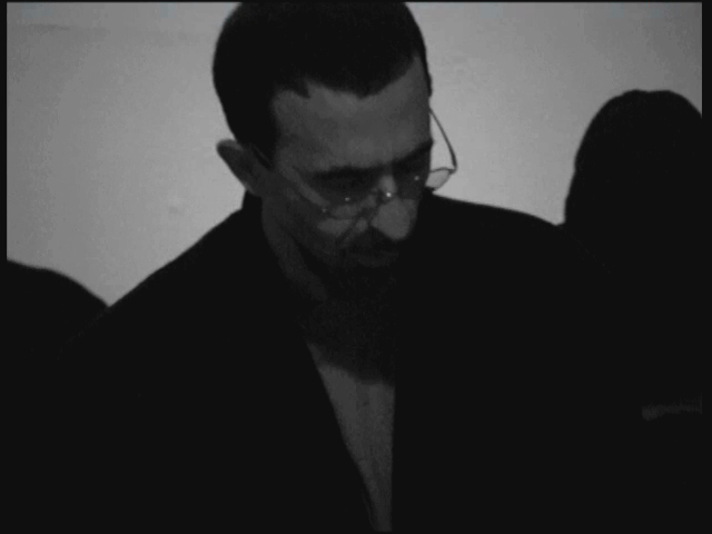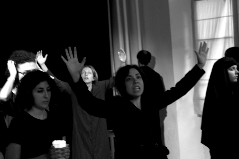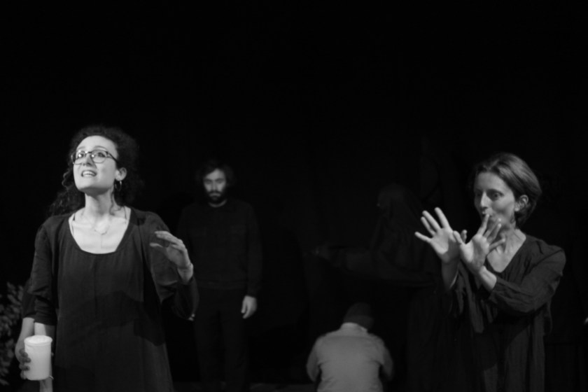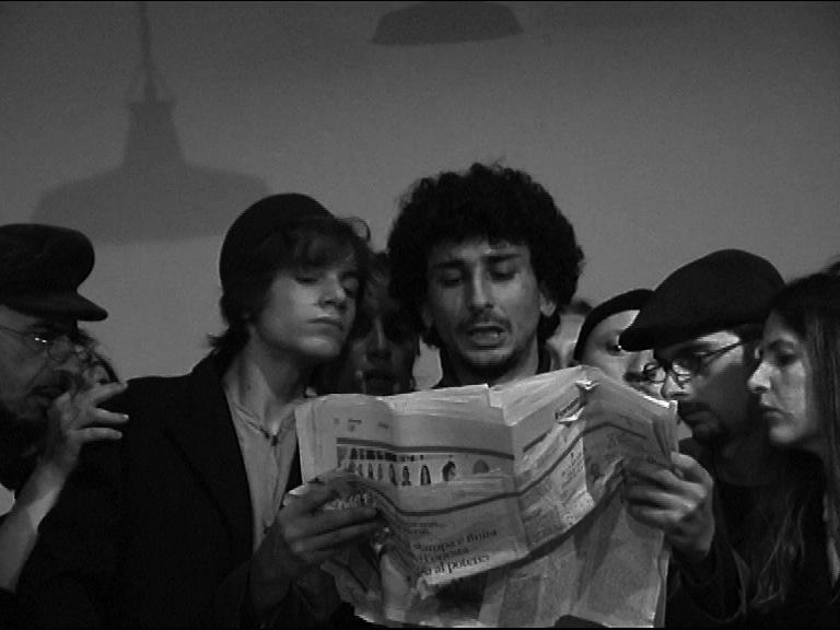 Ciascuno assume singolarmente un testo diverso. Tutti sono immersi nello stesso spazio poco illuminato e vanno e vengono ciascuno per sé.