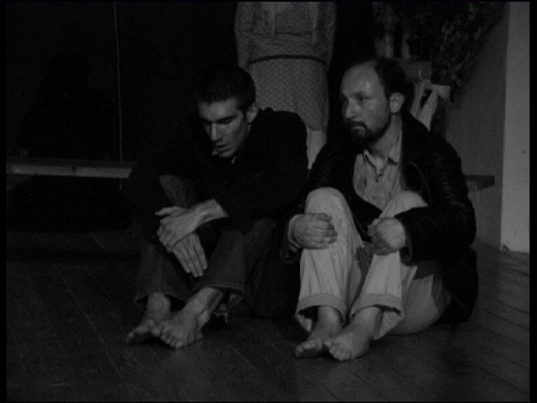 All together they get up – 3,4 chairs – some are standing or sitting on the floor. Something is agitated, confused, two want the same chair, they are restless, agitated and end up sitting very close to each other. They look at each other. Curiosity. Attraction – they change places – they look at each other – one takes off his jacket- one puts it back on- one is cold- waiting- impatience. Patience – tiredness – hints of gestures towards one or the other – one makes as if to leave and is pulled in by another.